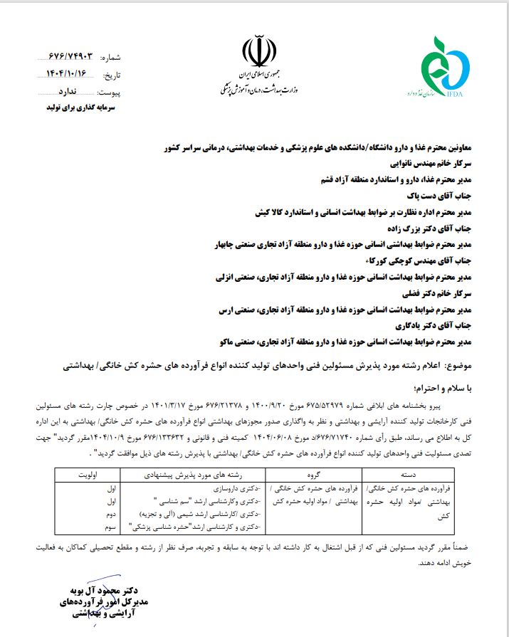 اعلام رشته مورد پذیرش مسئولین فنی واحدهای تولید کننده انواع فرآورده های حشره کش